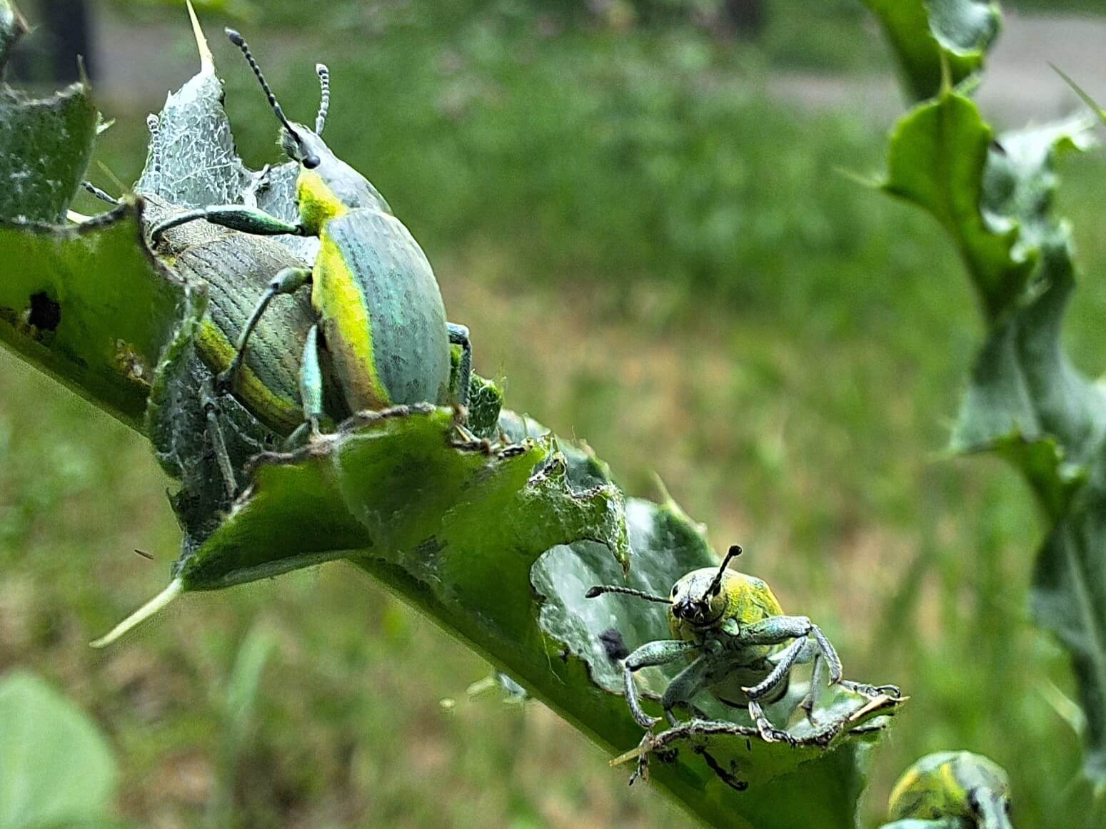De groene distelsnuitkever onderscheidt zich van andere snuitkevers door de gele zijrand. De groene distelsnuitkever eet bladeren van loofbomen.
