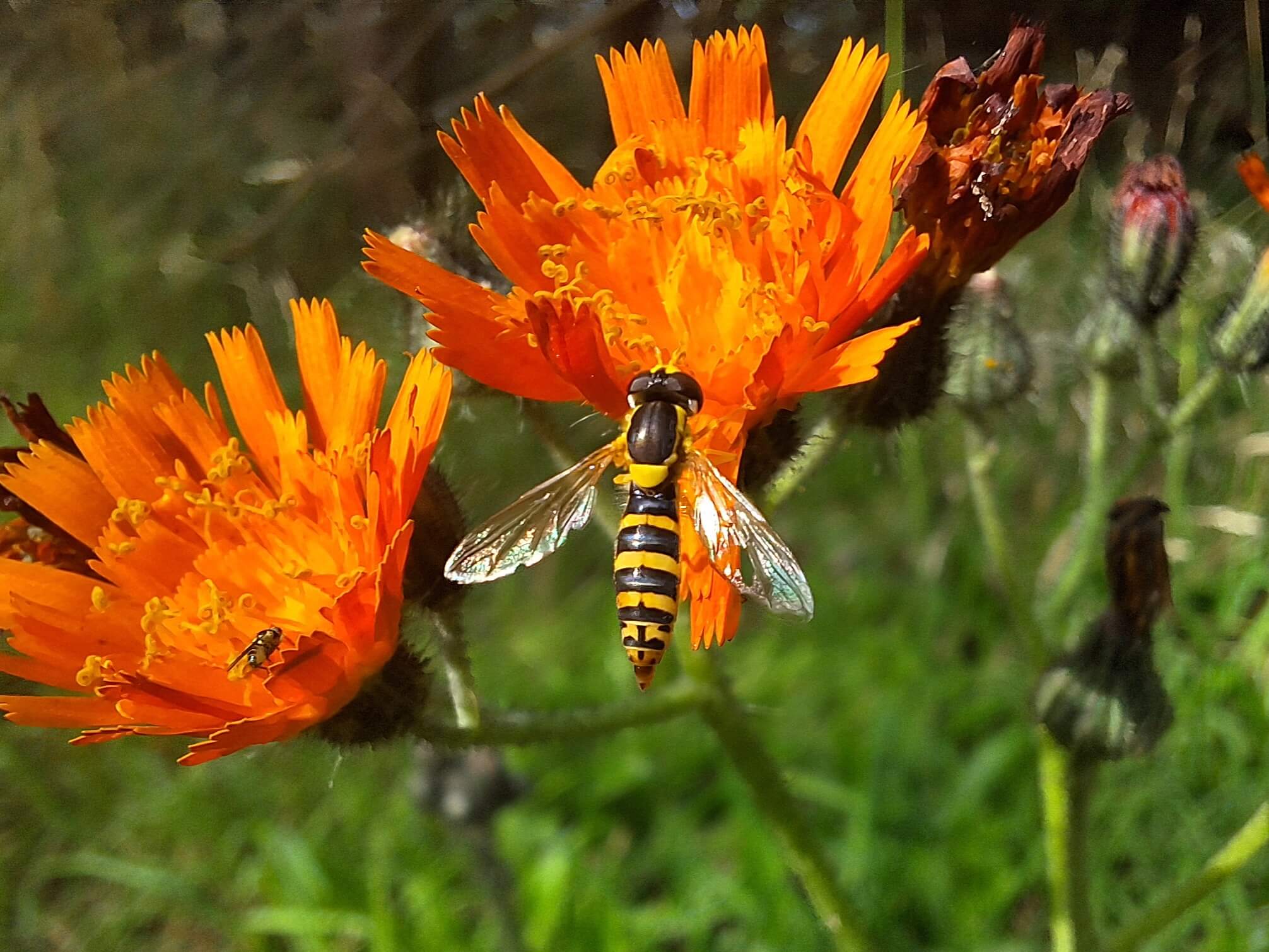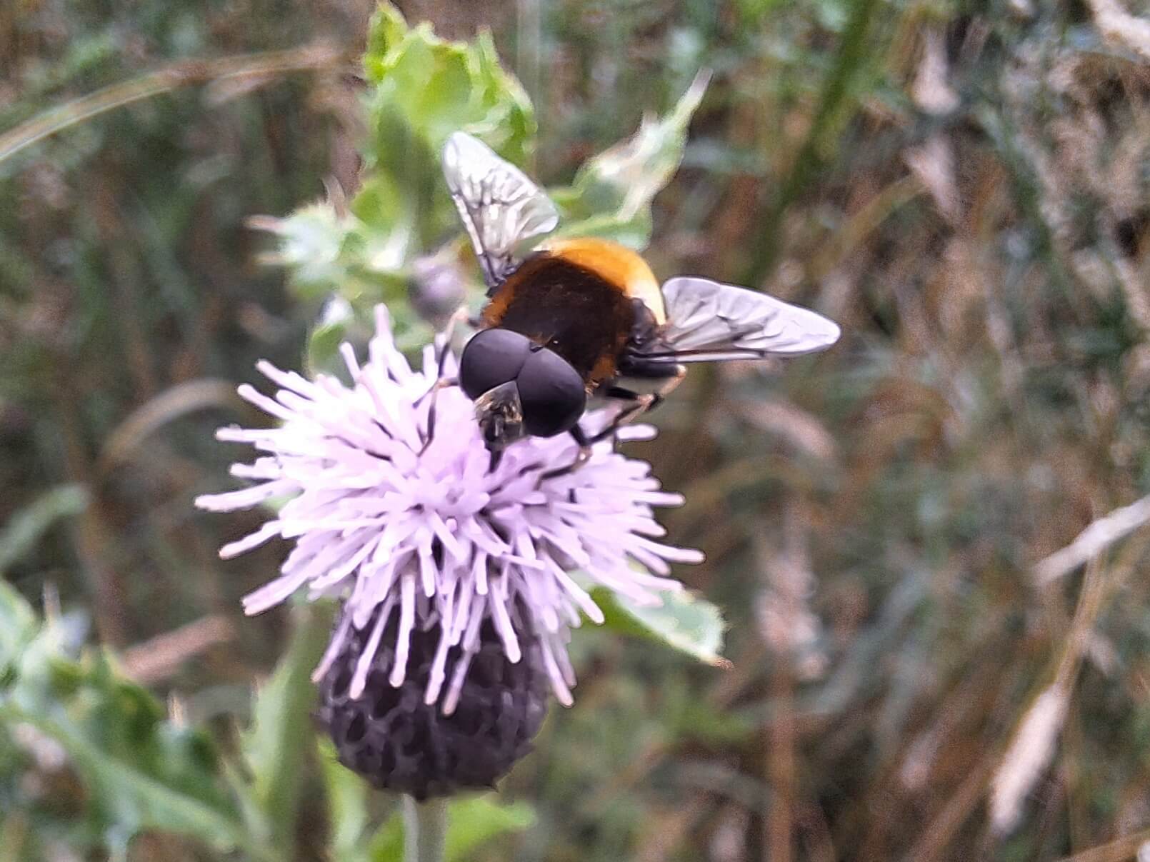 Gewone pendelvlieg: De gewone pendelvlieg is een zweefvlieg die bijna overal te vinden is. Je kunt hem vinden op bijvoorbeeld de wilde peen, boterbloemen, of in dit geval distels.
