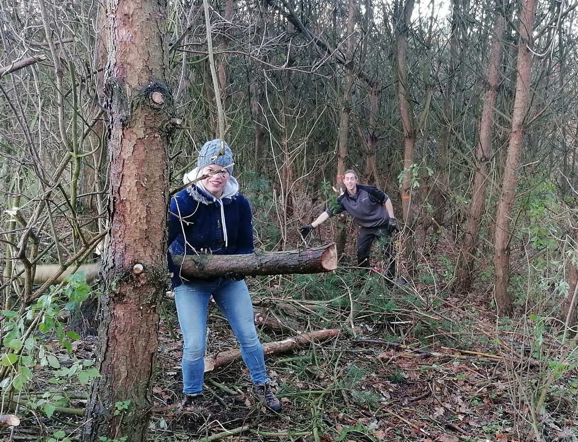 “Omdat Mepperdennen een jong aangeplant bos is, is het soms goed om te dunnen op plekken waar bomen dicht naast elkaar groeien. Bomen groeien namelijk enkel de lucht in, als ze niet voldoende ruimte hebben. Het kan dan zomaar zijn dat er veel bomen omwaaien tijdens een storm en elkaar hierin meenemen. Dan ben je dus terug bij af”, vertelt Ewoud. Na het dunnen ontwikkelen de bomen die zijn blijven staan dikkere stammen. Zo ontstaat er een sterker bos, met op den duur ook een cyclus waarin het zichzelf beter kan onderhouden. Met zijn drieën zetten we flink onze schouders eronder. Ewoud zet de zaag in de zwakke bomen en Sigrid en Mayke slepen de takken en stammen op een hoop.