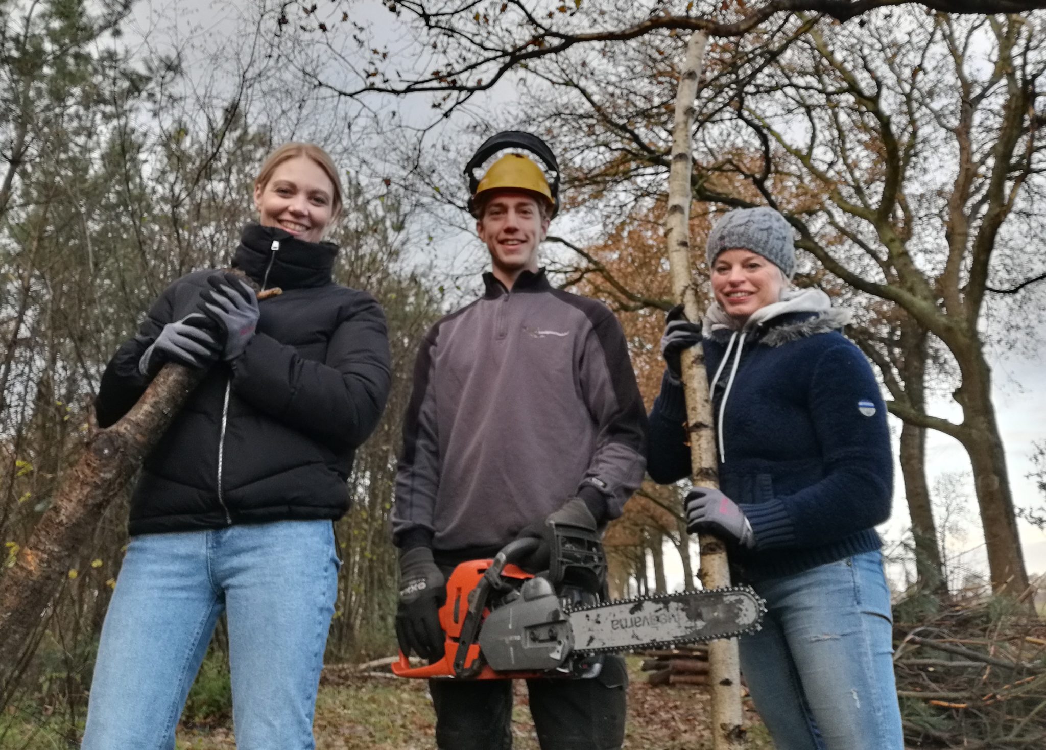 Zelfs onze natuurbeheerder Ewoud ziet soms even door de bomen het bos niet meer. “Ik ben flink aan het dunnen geweest aan de rand van de Mepperdennenweg, maar het schiet niet erg op in mijn eentje”, vertelde hij laatst tijdens de lunch. Soms zijn er van die klusjes die je veel beter samen kunt aanpakken. Nu zijn wij als team in het ontvangsthuis natuurlijk helemaal de beroerdste niet en willen we best even onze handen uit de mouwen steken om Ewoud te helpen. Daarom trokken Sigrid en Mayke vanochtend de laarzen en werkhandschoenen aan om meters te gaan maken aan de Mepperdennenweg.