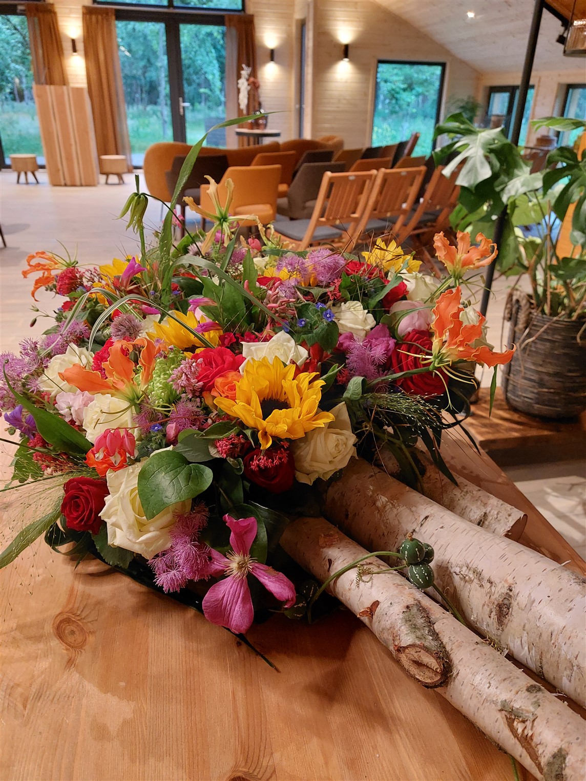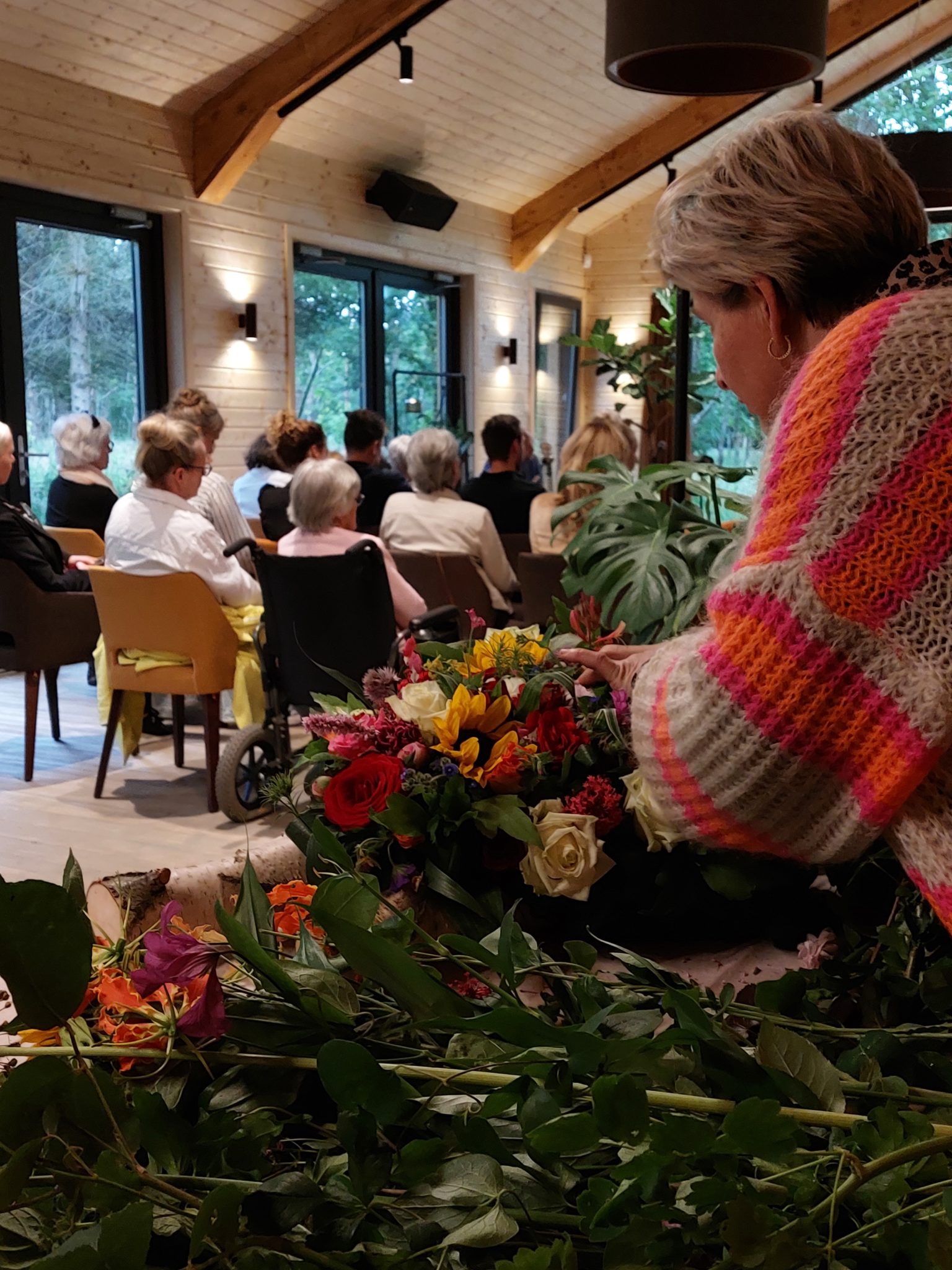 De avond begon met het in ontvangst nemen van de meegebrachte bloemen. Onze bloemist maakte hier een prachtig gezamenlijk kunstwerk van, wat symbool staat voor de verbondenheid met elkaar.