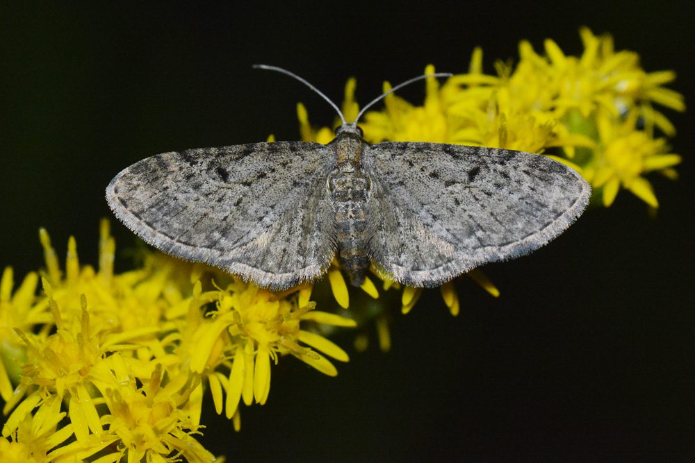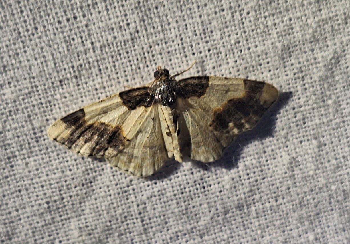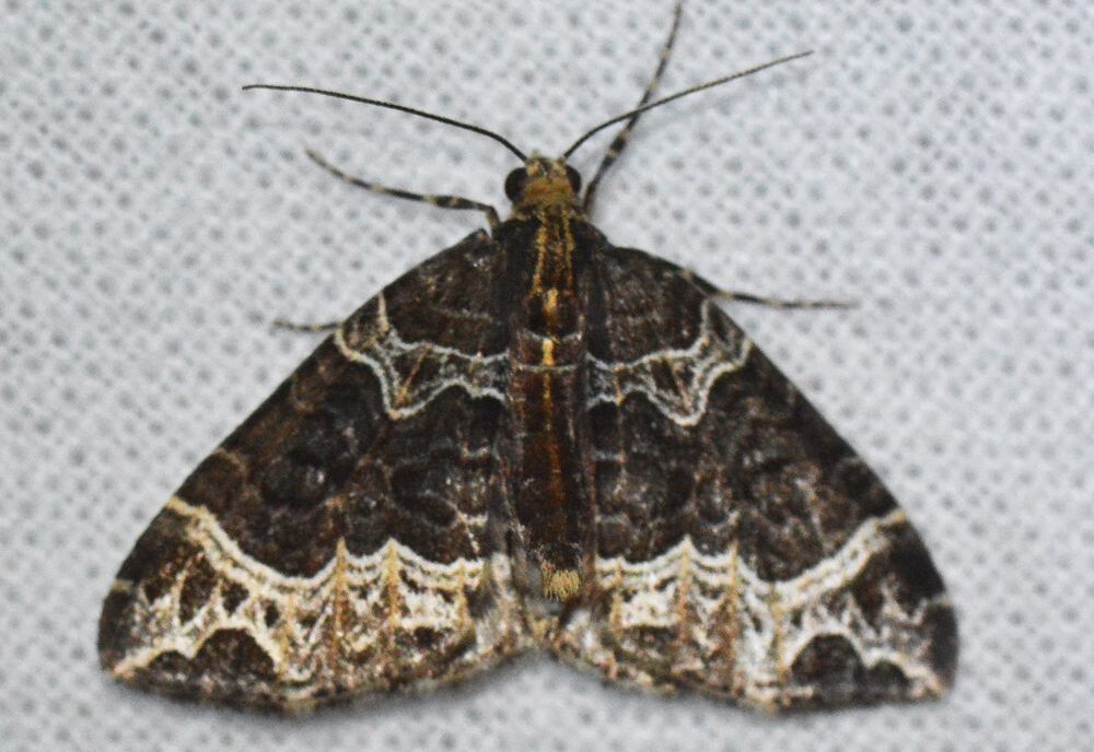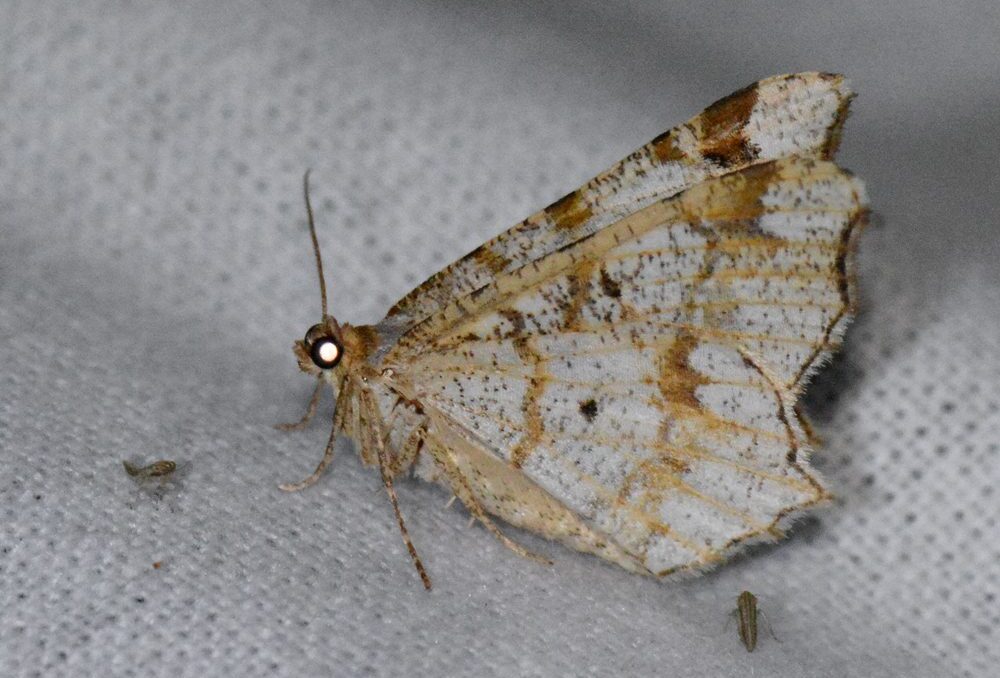 Het was gelukkig droog deze avond, maar nog net iets te fris. Maar hoewel de omstandigheden niet helemaal optimaal waren, was er wat later op de avond steeds meer activiteit rondom het doek te zien. Wat me al gauw wist te verrassen, was de schoonheid van sommige nachtvlinders. Ik wist niet dat er zoveel prachtige nachtvlinders bestonden. We zagen acht verschillende soorten spanners, op en rondom het doek. Spanners hebben brede vleugels en een smal lijfje. Hun vleugels houden ze meestal plat.