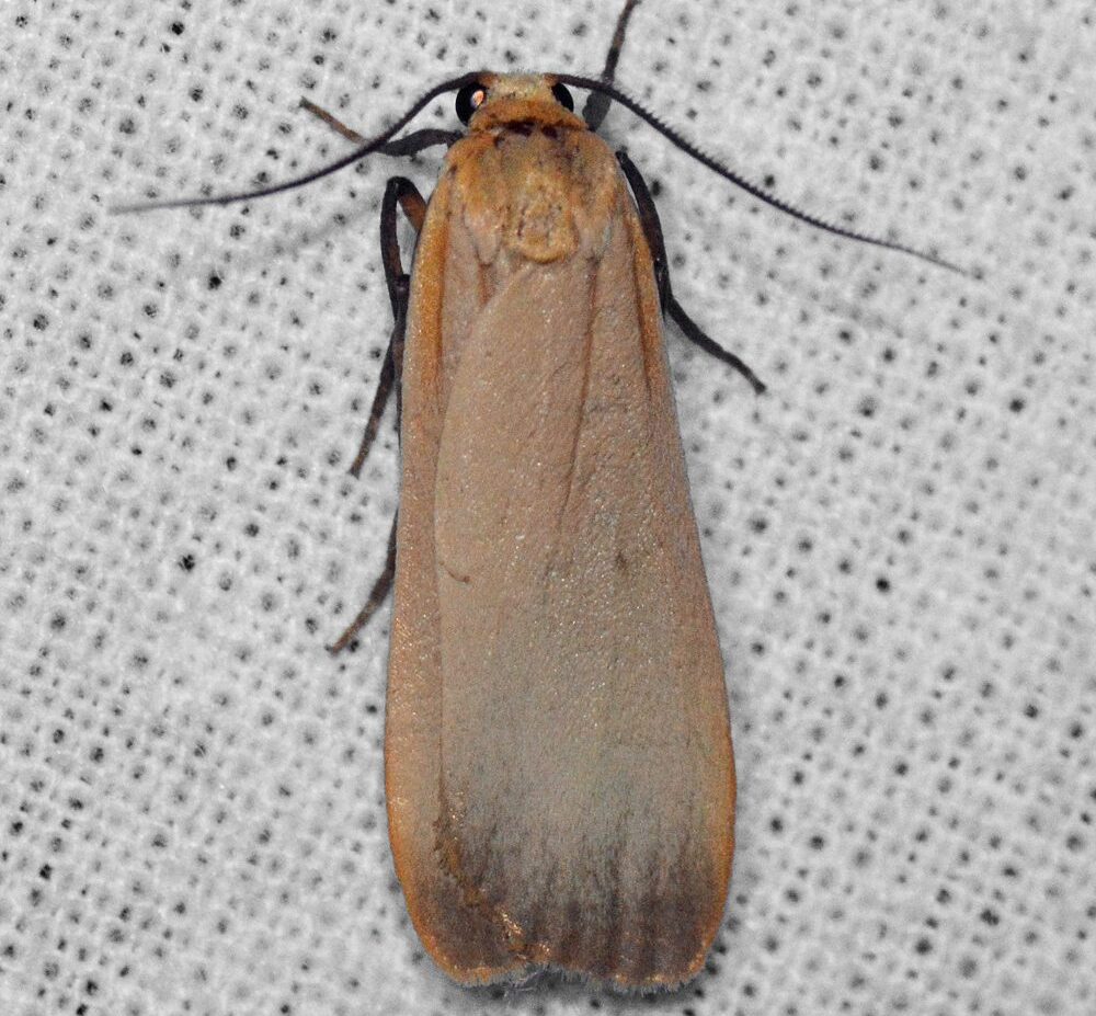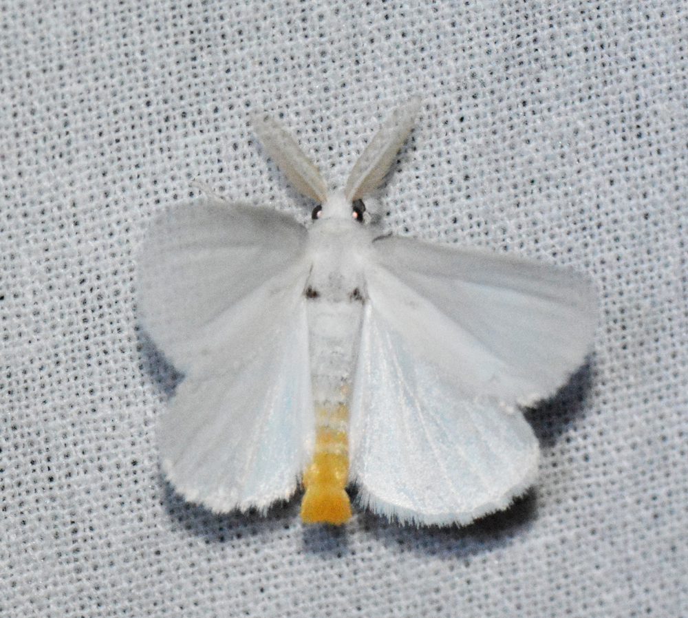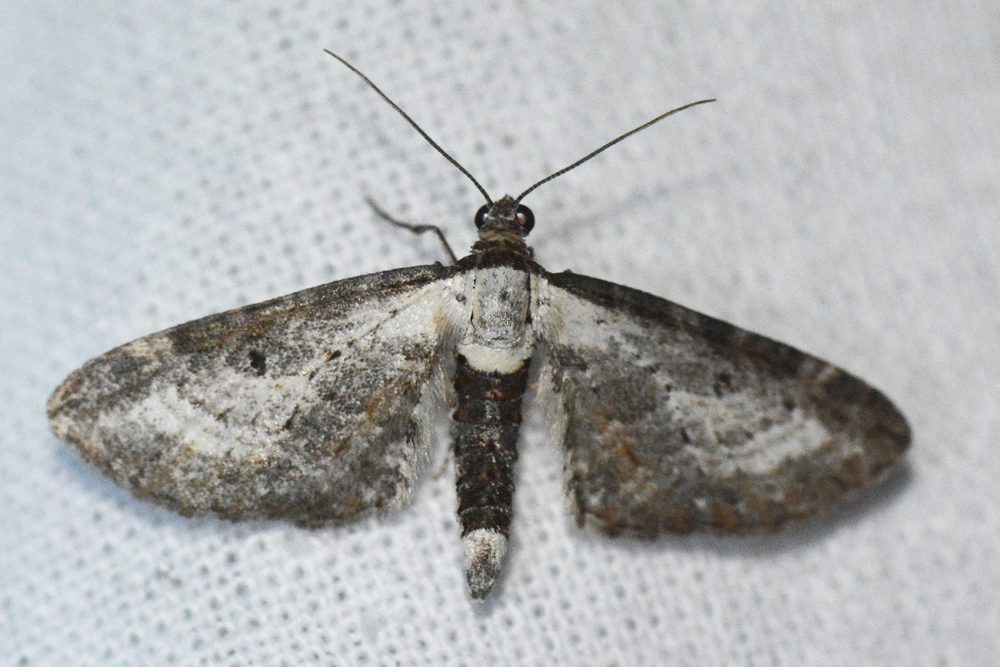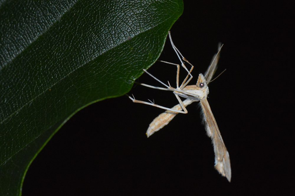 De familie die in aantallen goed vertegenwoordigd was, maar in varianten iets minder, was de vedermot. Wat een grappige nachtvlinderfamilie is dit. Ze doen hun naam eer aan, doordat hun vleugels bestaan uit smalle reepjes, waardoor het op een veertje lijkt. Als ze rusten, dan vormen ze met hun lijfje en vleugels de vorm van een T. Ook een rode eikenlichtmot uit de familie snuitmotten en een kroonvogeltje uit de familie tandvlinders konden we deze avond aan de ‘collectie’ waarnemingen toevoegen.