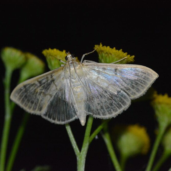 Van de grasmotten liet vooral de parelmoermot zich veelvuldig zien. Boerenwormkruid bleek voor deze nachtvlinder met een parelmoerglans een favoriet. De rupsen leven vaak in gras, of andere lage planten. Ook de kleuren van de vlinders zijn onopvallend in het gras.