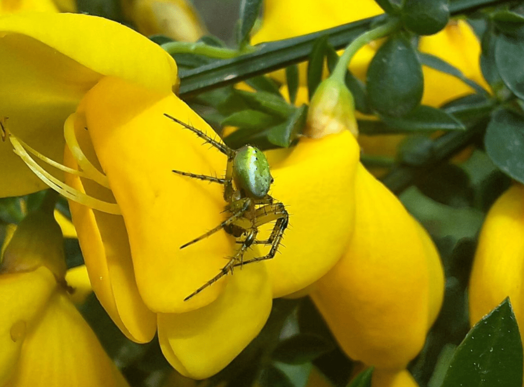 Een andere veel voorkomende spin is de komkommerspin. Deze spin is onder andere te herkennen aan zijn felgroene kleur, maar in de herfst kunnen ze bruin worden, voor een betere camouflage. De mannetjes wachten in het net, totdat het vrouwtje er klaar voor is om te paren. In zijn web vangt deze spin kleine insecten die hij doodt met een giftige beet. Voor mensen is deze beet niet gevaarlijk.