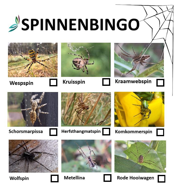 Het is u vast al opgevallen dat het weer spinnentijd is. Mannetjesspinnen komen tevoorschijn uit hun schuilplaats om vrouwtjes te zoeken waarmee ze zich kunnen voortplanten. Door de dauw zien we ze in deze periode ook veel beter. Hoewel veel mensen er rillingen van krijgen, zijn ze erg de moeite waard om eens goed van dichtbij te bekijken, want het zijn best fascinerende beestjes! Ook is het erg leuk om (bijvoorbeeld met kinderen) op spinnenzoektocht te gaan met onze spinnenbingo. Die kunt u onderaan deze pagina downloaden.