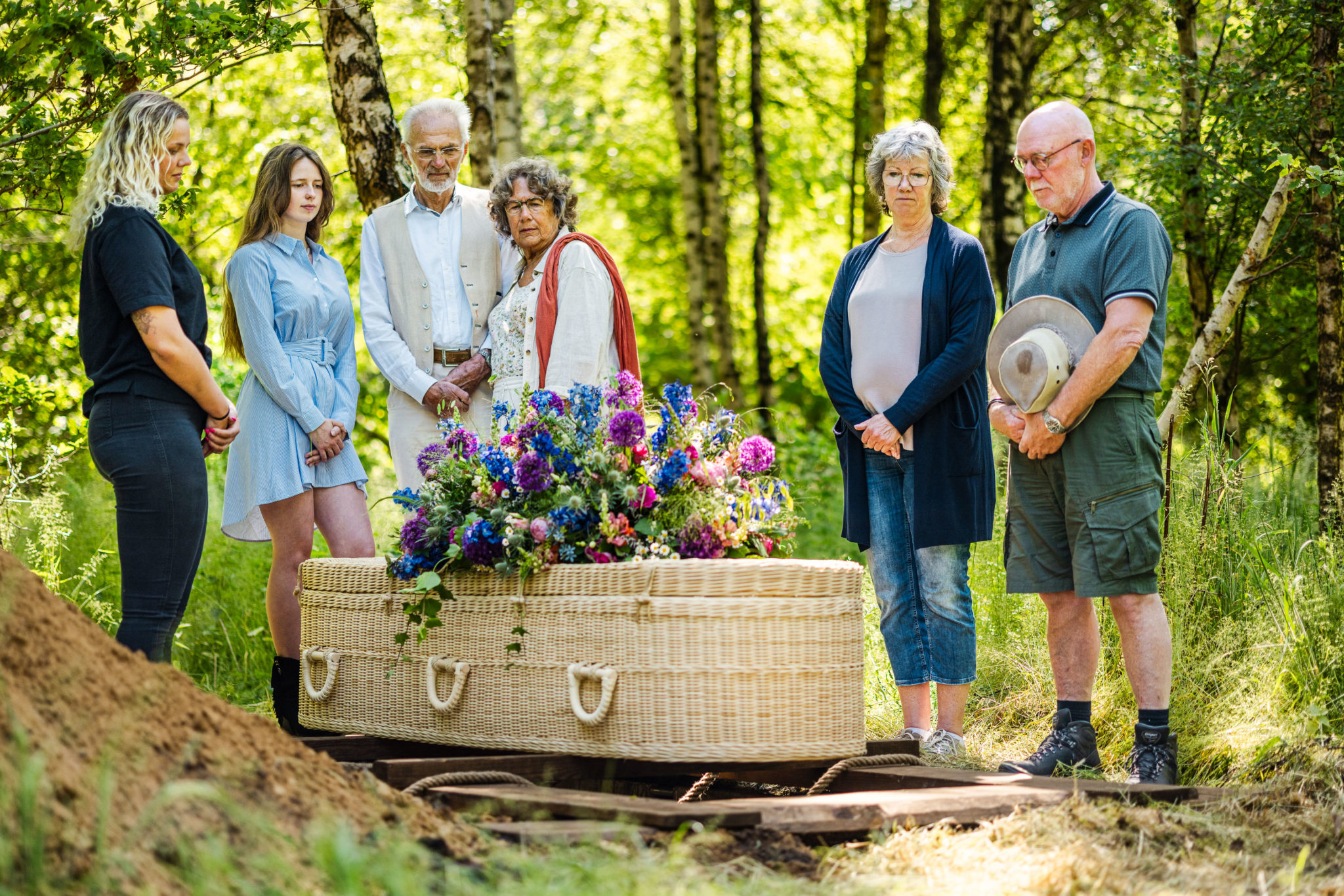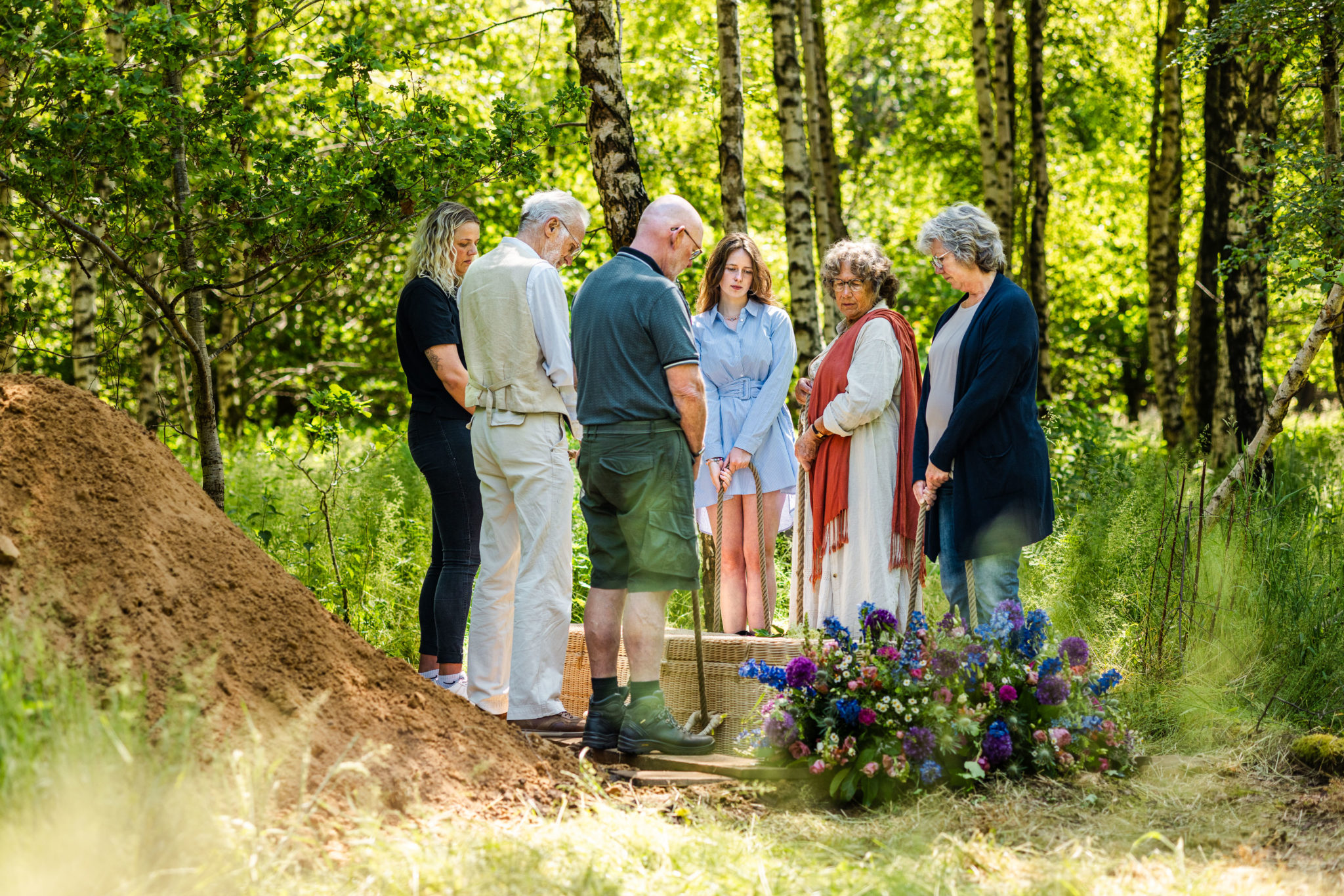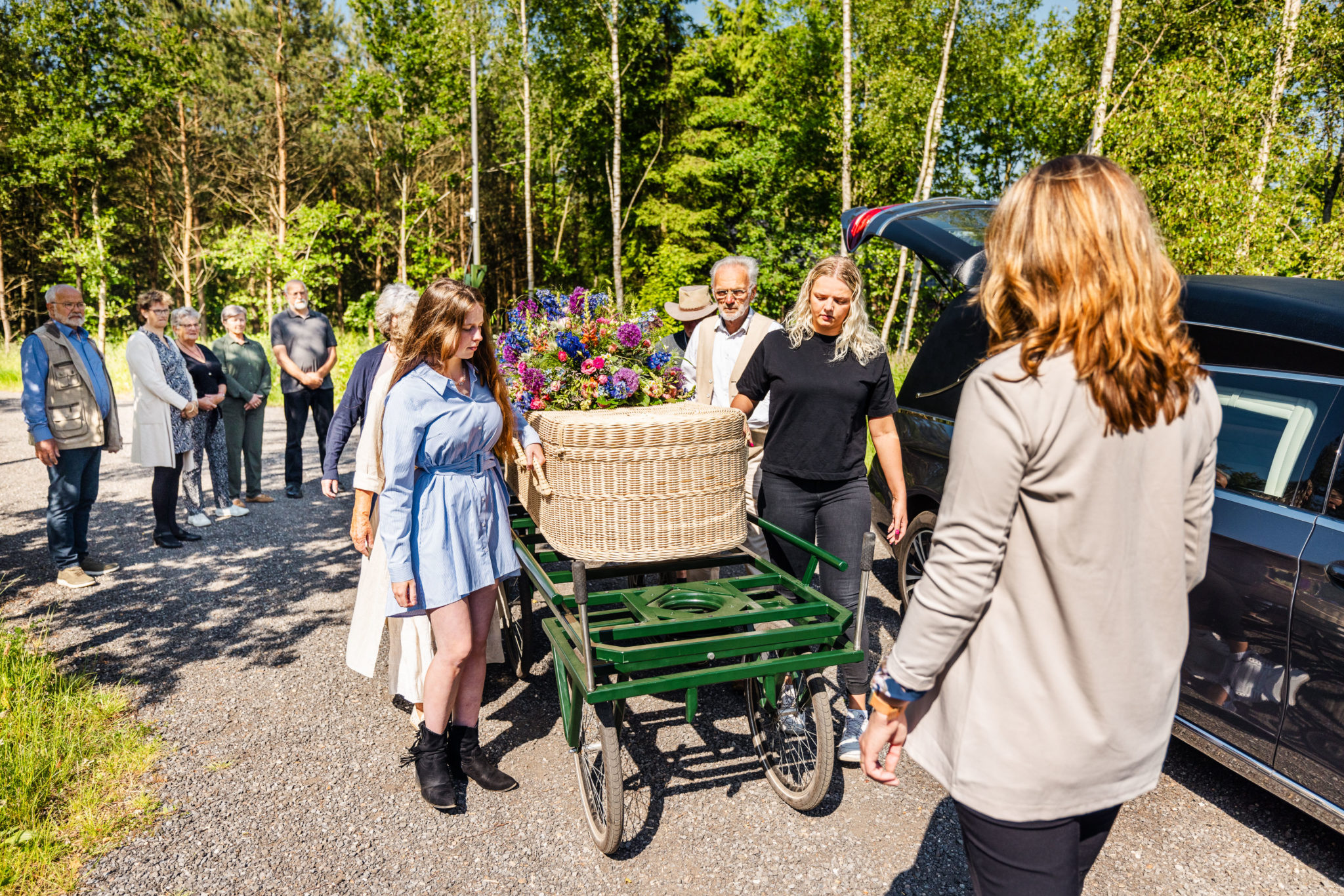 De laatste rustplaats van een overledene kan vlakbij of juist ver weg van het ontvangsthuis liggen. Voor een graf dat iets verder in het bos gelegen ligt kunt u rekening houden met een wandeling van zo’n tien tot vijftien minuten. De paden zijn graspaden en dus onverhard. Houdt u hier vooral vooraf rekening mee in de keuze van uw schoeisel. Mensen die slecht ter been zijn, mogen mee rijden in een elektrische wagen. Wij hebben voor maximaal drie personen ruimte op onze elektrokar. Rouwboeketten en bloemen mogen tot twee weken blijven liggen op het graf. Daarna halen wij de bloemen van het graf en neemt de natuur de verzorging van het graf over.
